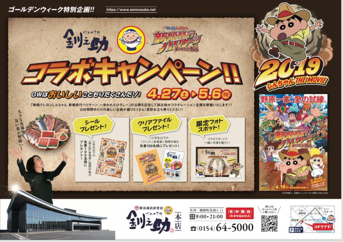 - GWの家族旅行需要の獲得を狙い、映画「クレヨンしんちゃん 新婚旅行ハリケーン ~失われたヒロシ~」とのタイアップ企画を実施。映画の素材と企業がタイアップしたインパクトのあるテレビCMを放映し、情報番組「情報ビュッフェ」でも紹介しました。また、店内ではキャラクターを使用したフォトスポットを設置したり、来場したお子様にキャラクターを使ったステッカーやクリアファイルをプレゼントするイベントを企画し、店舗集客につなげました。